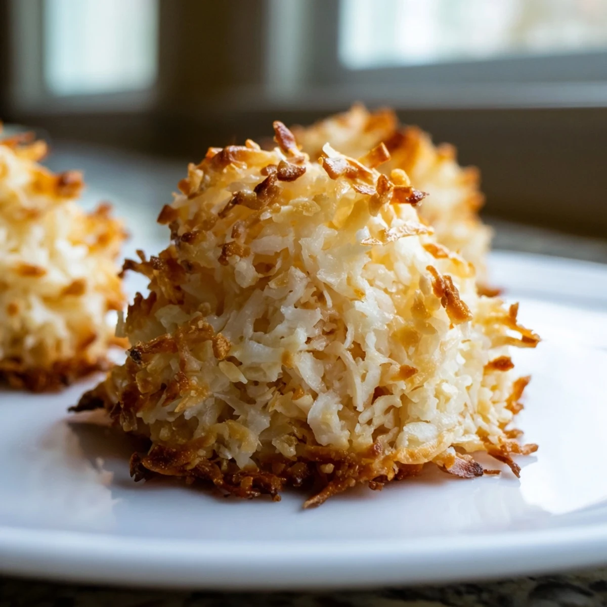 The combination of sweetened shredded coconut and egg whites creates moisture that remains during baking. The egg whites bind the mixture while the natural sugars caramelize, resulting in that characteristic chewy center with crispy edges.