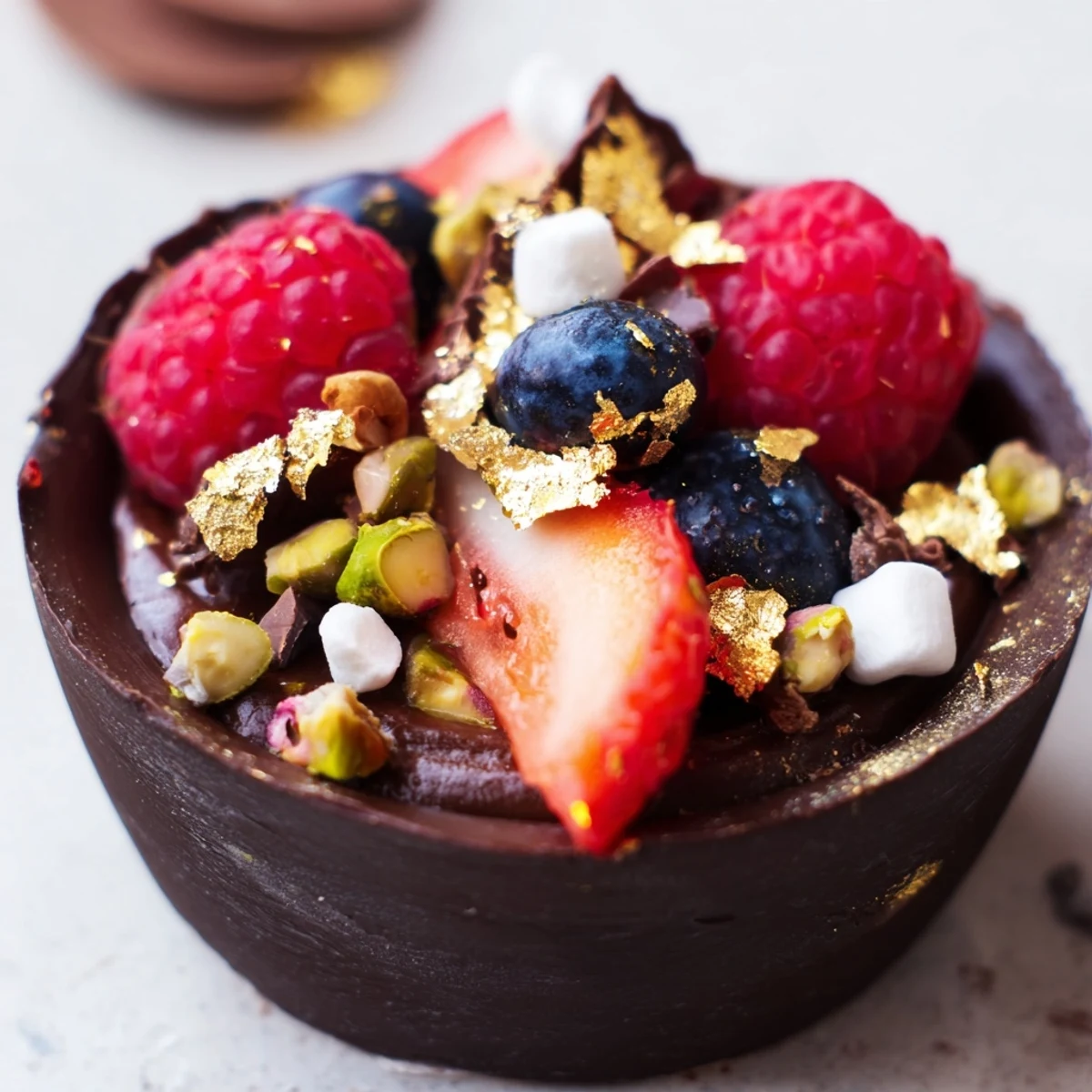 These elegant chocolate grazing cups feature delicate handmade chocolate shells filled with silky smooth chocolate mousse. Each cup is adorned with vibrant fresh berries, crunchy toasted nuts, fluffy mini marshmallows, and decadent chocolate curls. The contrast between the crisp chocolate cup, creamy mousse filling, and varied textures creates an irresistible dessert experience. Perfect for entertaining, these individual servings look stunning on dessert tables and allow guests to customize their experience with different toppings.