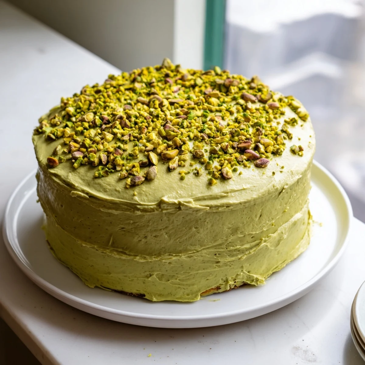 This decadent pistachio cake features moist, nutty layers bursting with authentic pistachio flavor. The cake is made with finely ground pistachios folded into a tender vanilla sponge, then generously layered and covered with silky pistachio buttercream frosting. Each bite delivers rich nuttiness balanced by creamy sweetness.