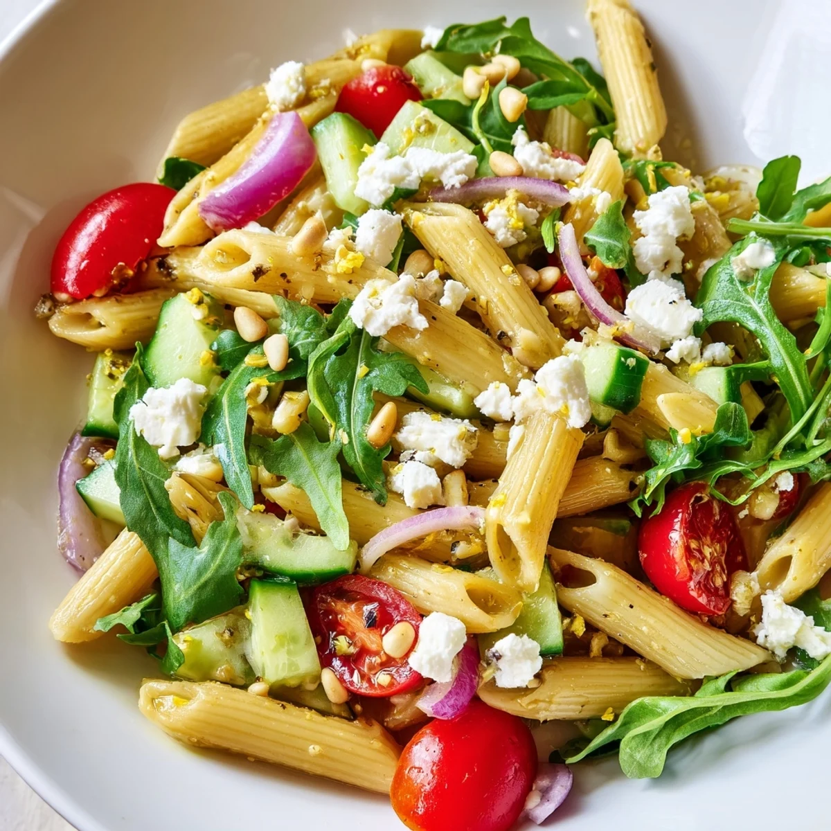 - Dump in the cooled pasta, arugula, tomatoes, cucumber, and onion, then toss until everything is coated in that bright dressing.