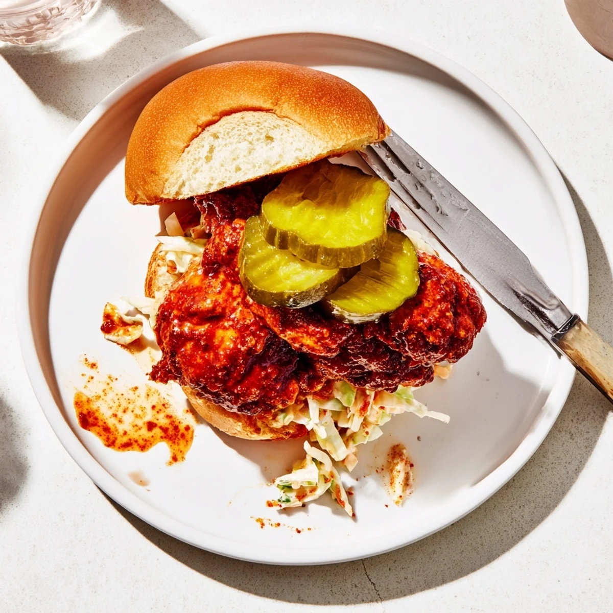 - Layer a sauced thigh onto each bun base, pile on crunchy pickle chips and a generous scoop of coleslaw, then crown with the top bun and serve right away for the best texture and flavor.